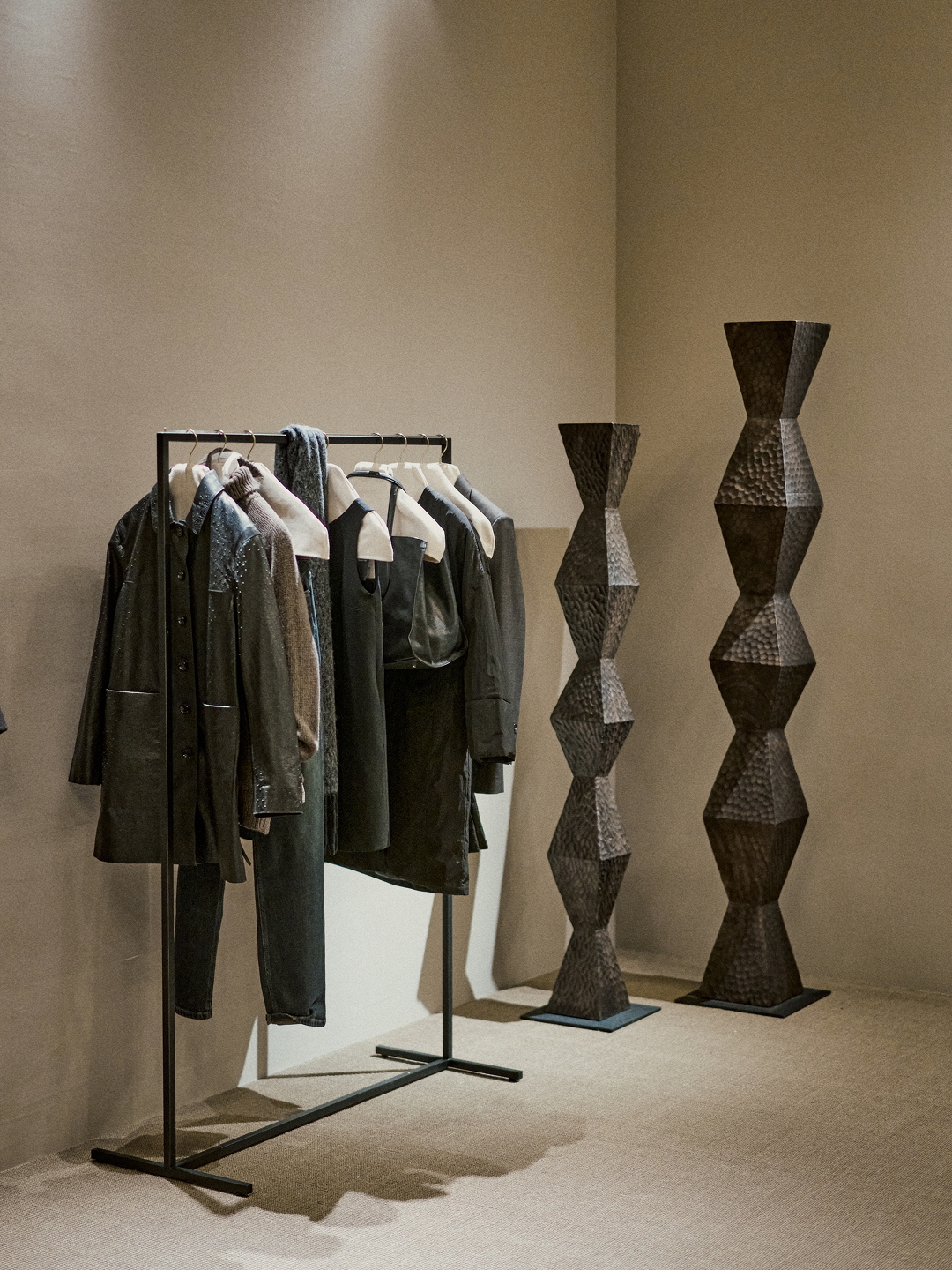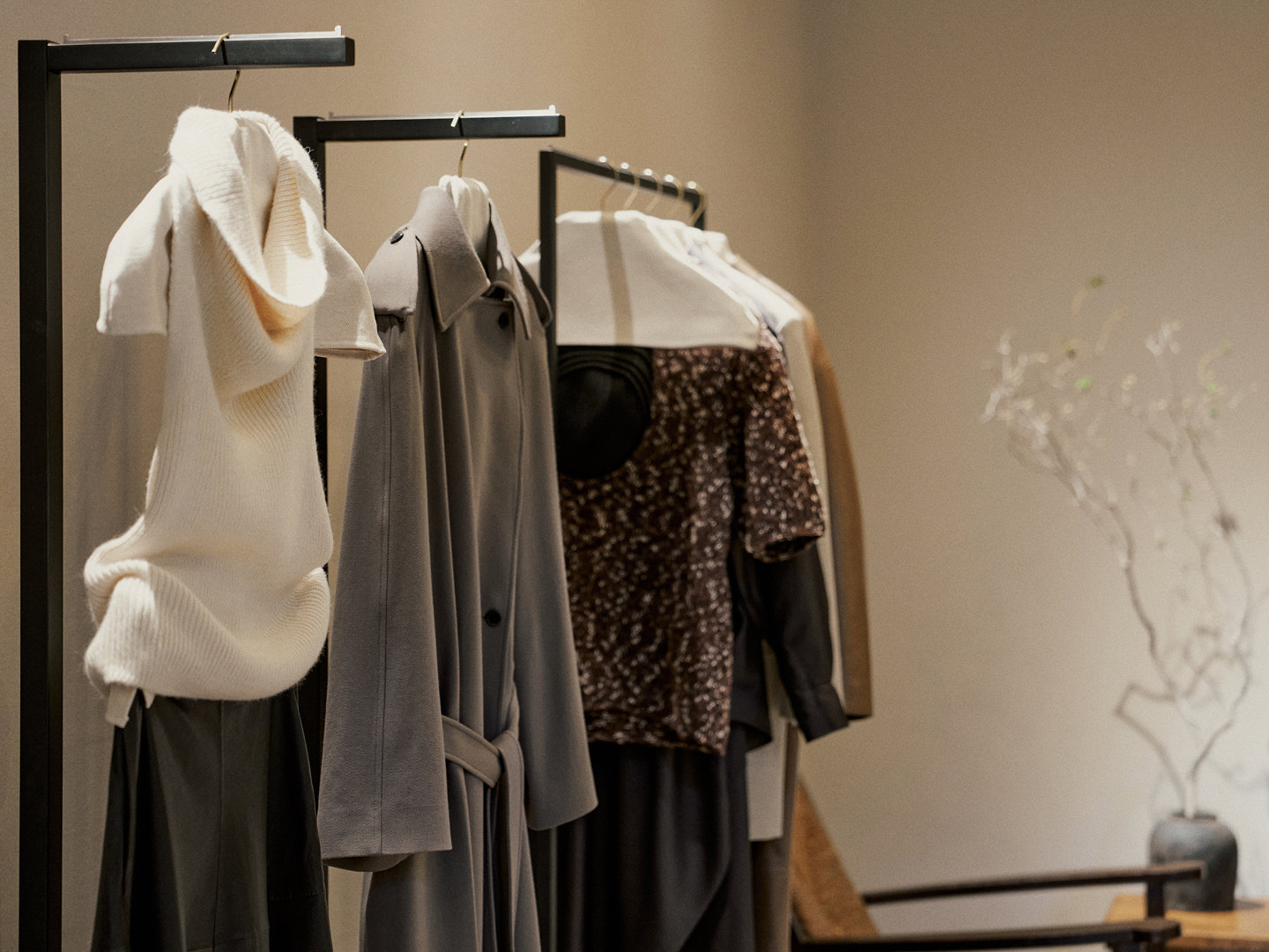 空间内陈列了品牌2025秋冬系列,包括羊绒、皮革等核心材质的成衣,通过中性色调与简洁轮廓延续品牌一贯的设计风格。产品在空间中的呈现更侧重材质与细节本身,减少额外装饰,让访客以较为直接的方式观察面料质地、剪裁结构与搭配关系。