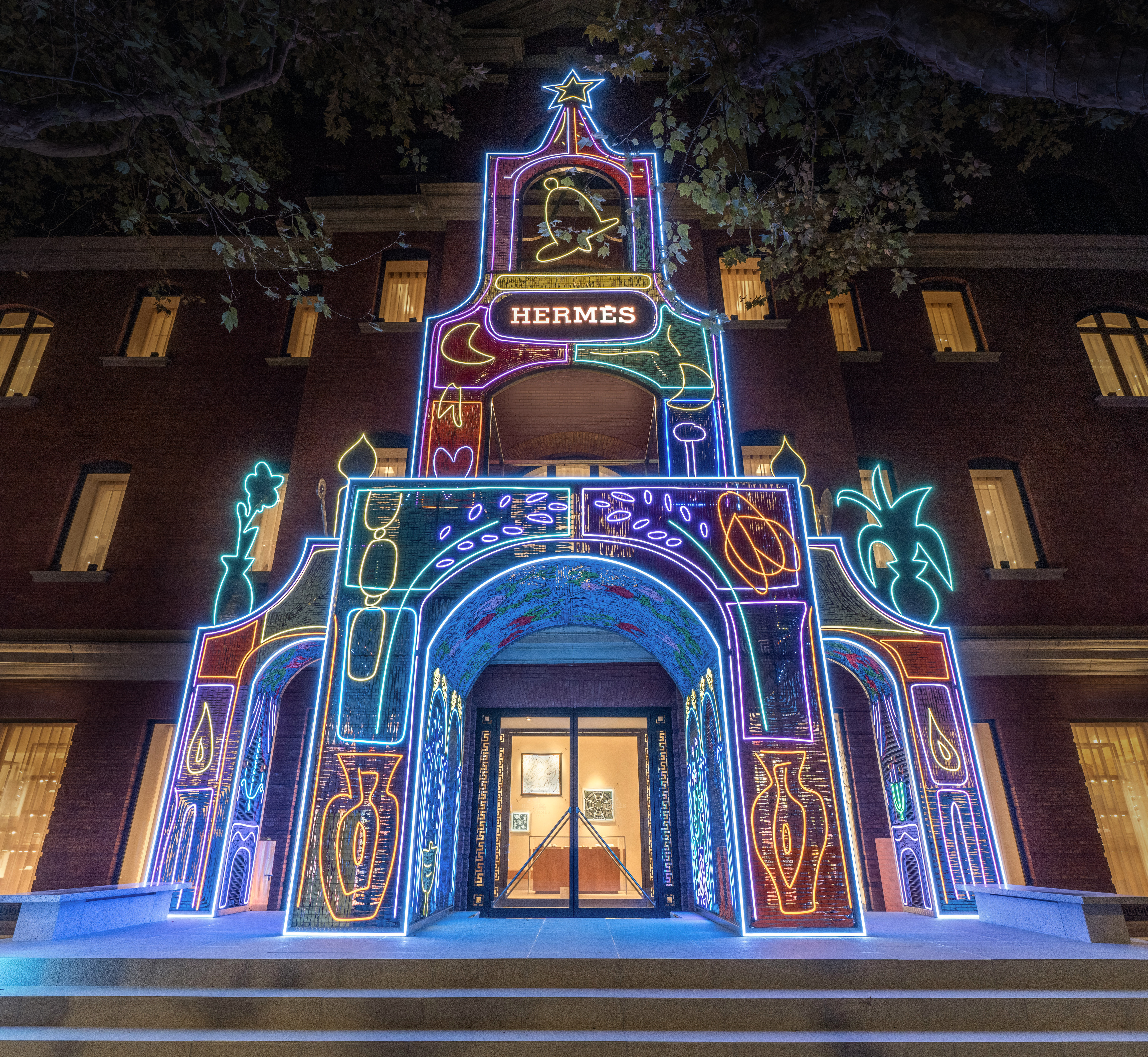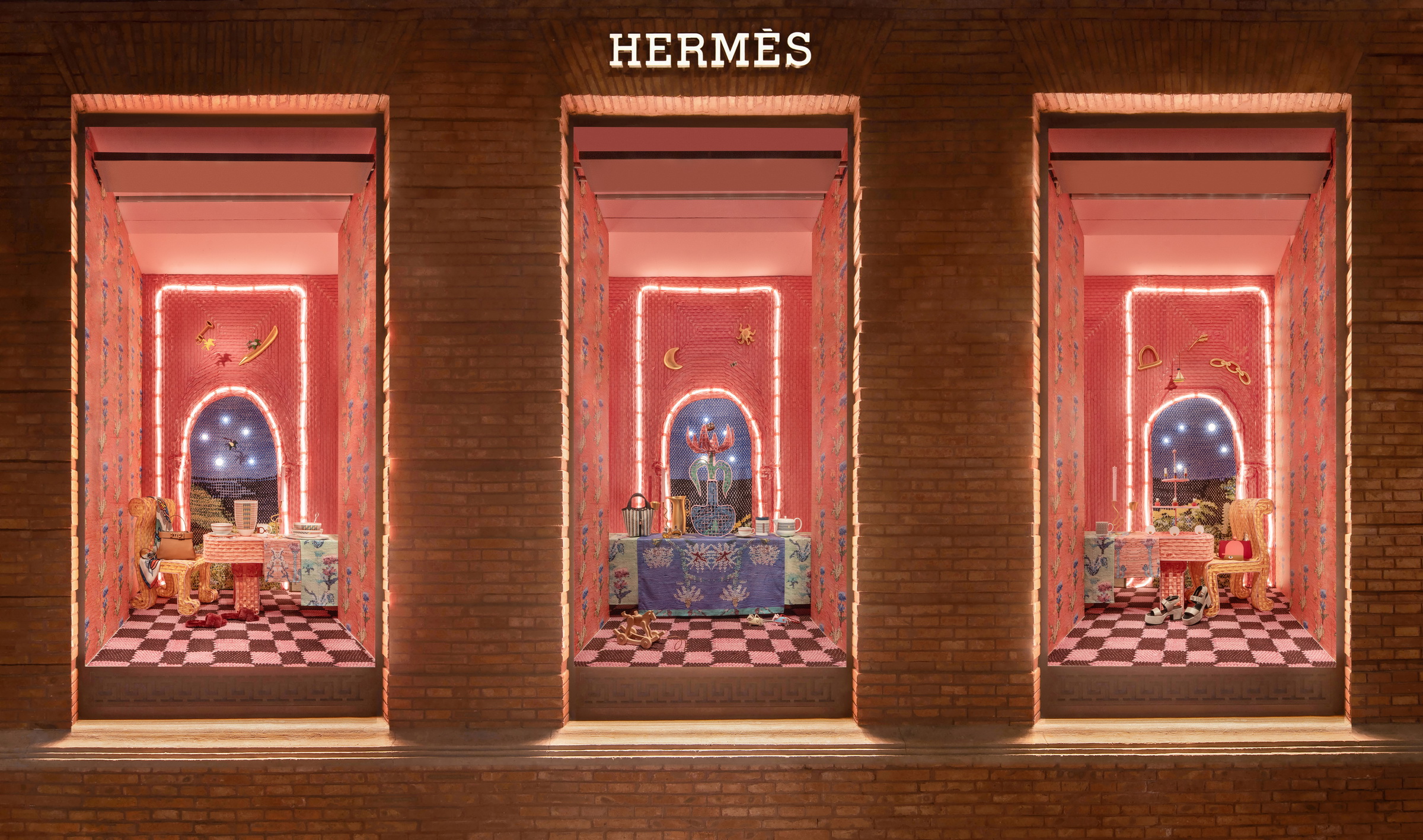 爱马仕于上海“爱马仕之家”推出冬季主题橱窗《冬日暖焰》,由法国艺术家 Delphine Dénéréaz 创作完成。本次橱窗以普罗旺斯的节庆场景为基础,通过编织、符号拼贴与色彩叙事呈现节日前夕的家庭仪式与生活意象。