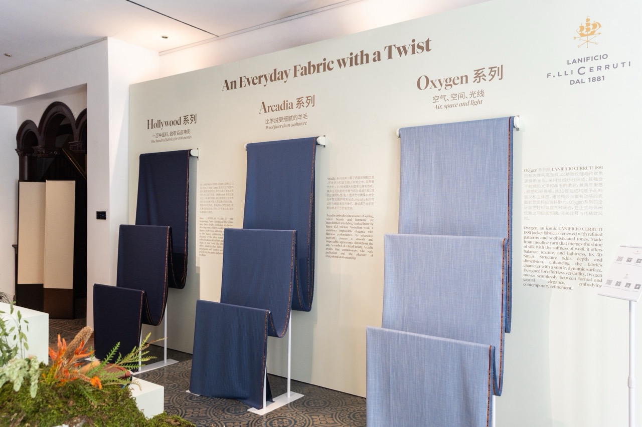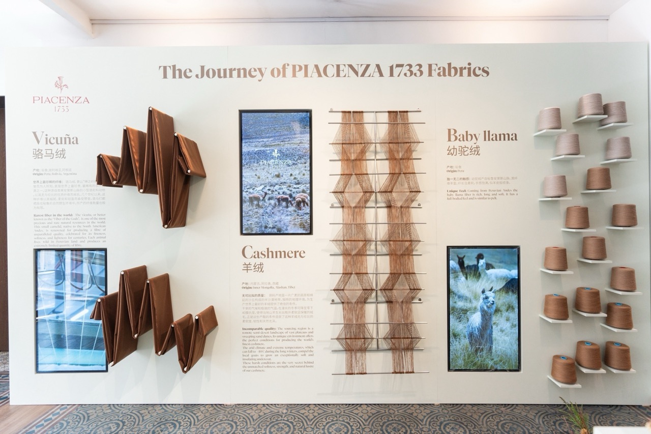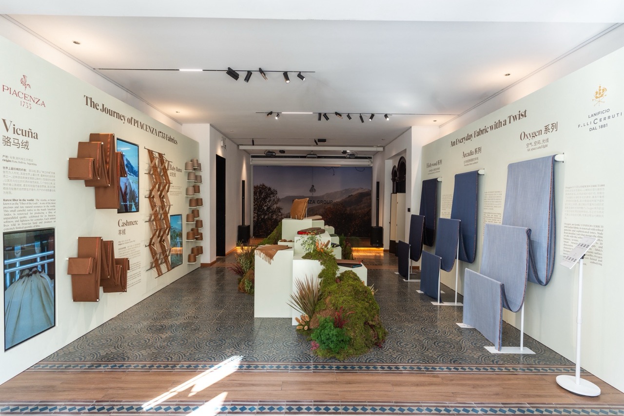 展览以材质旅程为叙事主线,结合纤维、纱线与成品面料的展示,让来宾观察不同纤维从原料到成衣的工艺路径。空间装置灵感取材自Piacenza家族位于意大利比耶拉的Burcina自然公园,以植物、纤维与织物形成层次关系,使“自然—纤维—面料”的转化过程更具可视化表达。