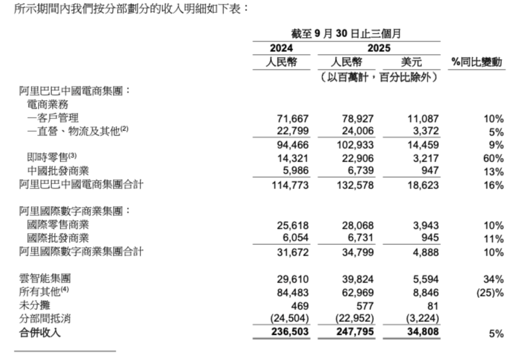 11月25日,阿里巴巴集团(NYSE:BABA,09988.HK)发布2026财年第二季度财报(2025年9月底止季度业绩),营收同比增长5%至2477.95亿元,超市场预期,剔除高鑫零售和银泰已出售业务影响,收入同比增长15%。