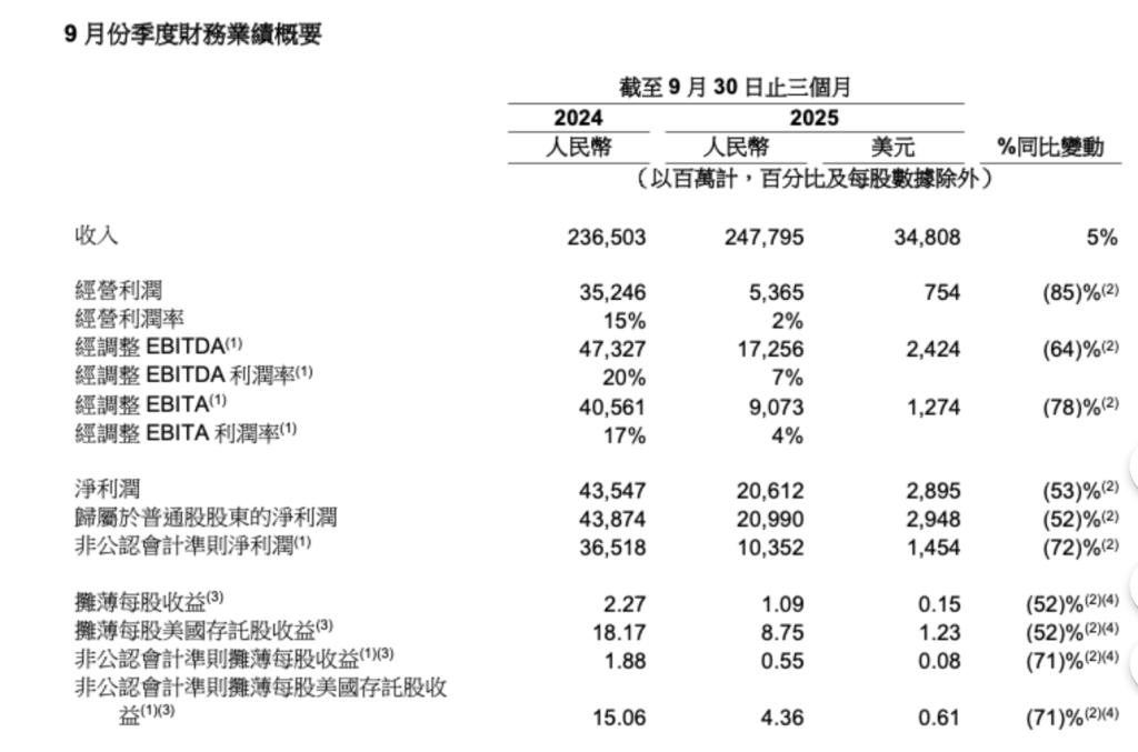 经调整EBITA(一项非公认会计准则财务指标,息税前利润)同比下降78%至90.73亿元;归属于普通股股东的净利润209.9亿元,同比下降52%;非公认会计准则净利润为103.52亿元,同比下降72%。