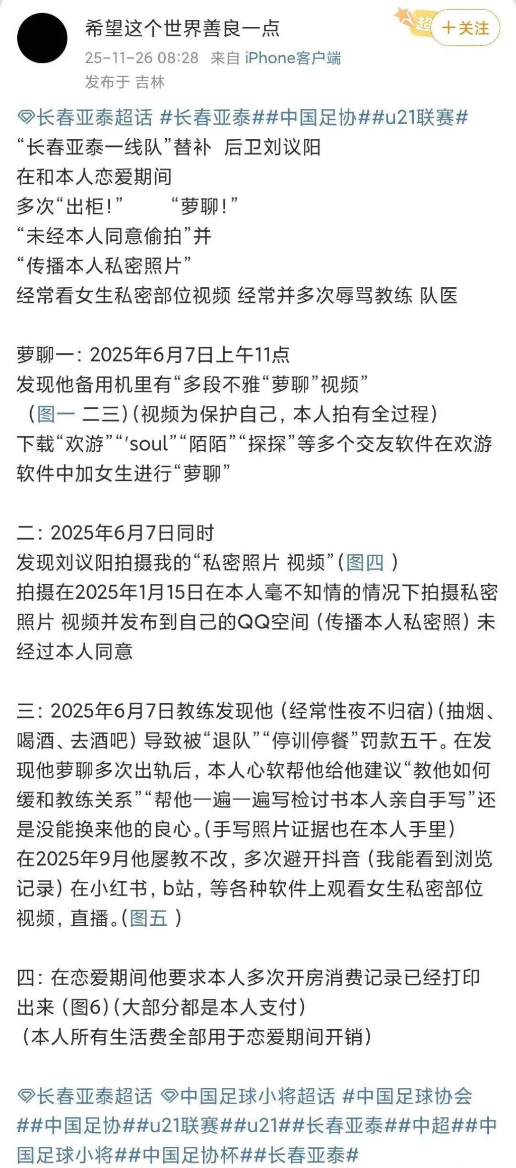 11 月 26 日,一位自称是长春亚泰 U21 后卫刘议阳的女友在多平台发文,称刘议阳出轨、裸聊、拍摄自己私密照,同时经常夜不归宿导致被退队。