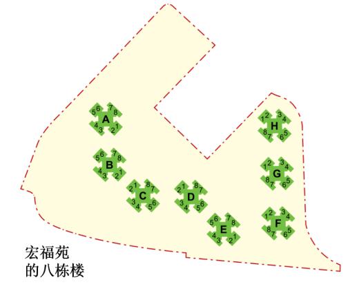 宏福苑建于 1983 年,从 A 栋到 H 栋,一共有八栋楼,各 31 层,一共有 1984 套房,居住 4600 人左右。