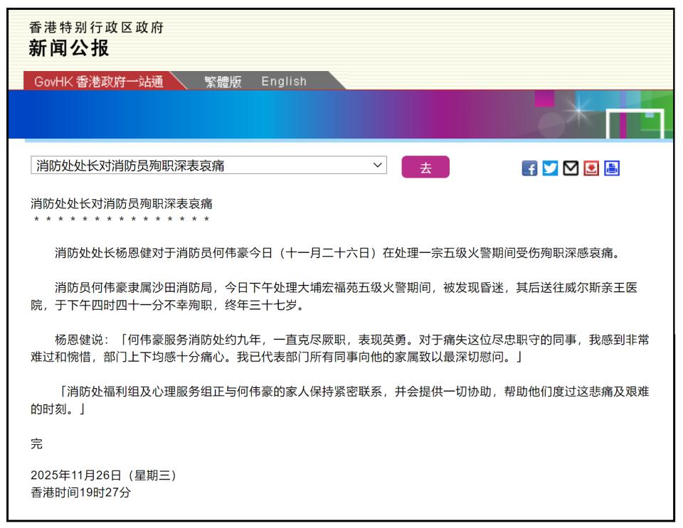 何伟豪的同袍晚上在社交媒体,发布两人在何伟豪从消防学校毕业时的合照悼念战友,形容 " 我们不会忘记你的,感激你为我们付出所有。好好休息 ……
