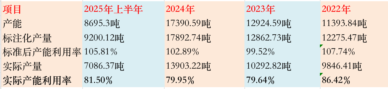 2022年至2025年上半年,嘉德利产能分别为1.14万吨、1.29万吨、1.74万吨和8695.3吨,标准化产量分别为1.23万吨、1.29万吨、1.79万吨和9200.12吨,据此计算的产能利用率分别为107.74%、99.52%、102.89%和105.81%。公司解释称,标准化产量系将不同厚度的BOPP电工膜产能和产量统一换算为5.0μm标准规格所得。