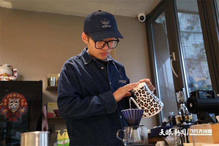 " 吾界咖啡 " 培训部经理莫斯竣正在制作咖啡