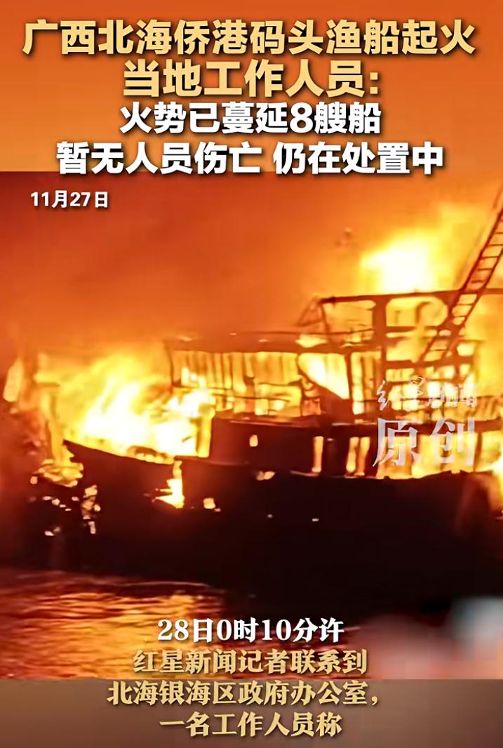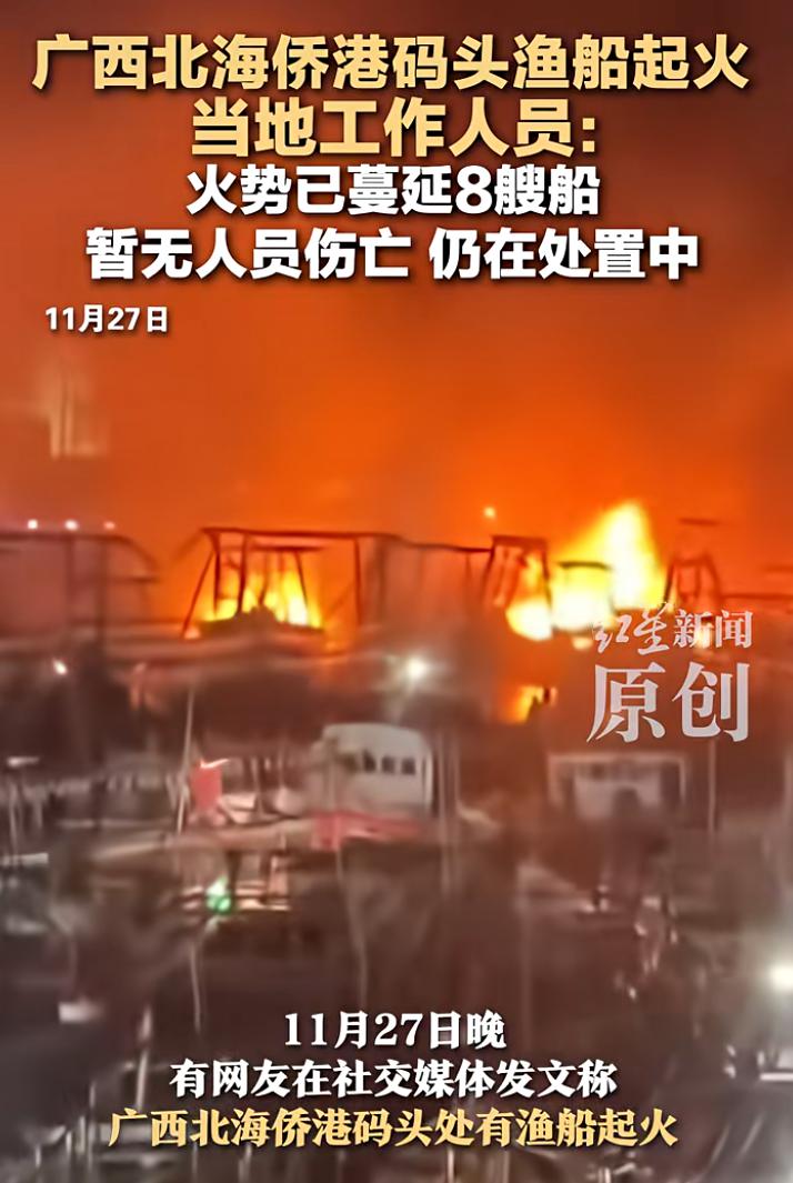 据红星新闻,11 月 27 日晚,有网友在社交媒体发文称,广西北海侨港码头处有渔船起火。