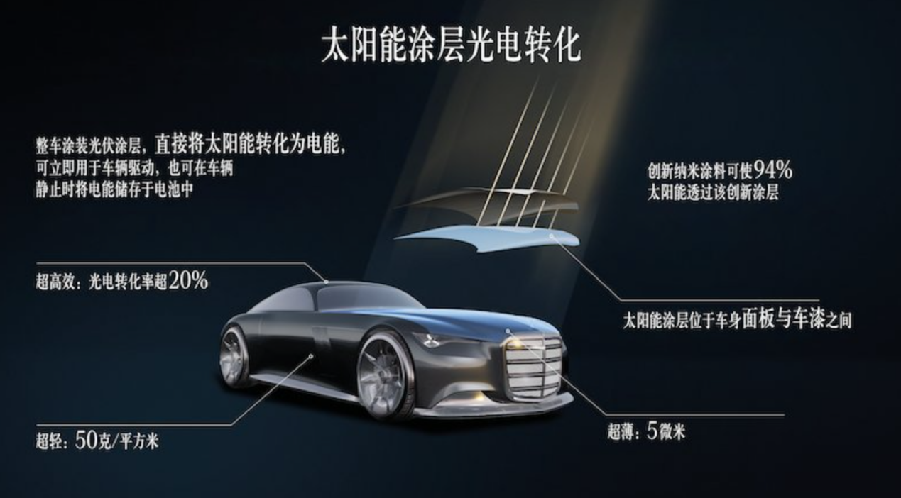 在理想条件下,11平方米(相当于一辆中型SUV的表面积)太阳能涂层每年产生的能量可增加12000公里续航。而且,该涂层不含稀土元素和硅元素,且便于回收利用。太阳能电池拥有高达20%的效率,即使车辆处于熄火状态时也能持续发电。