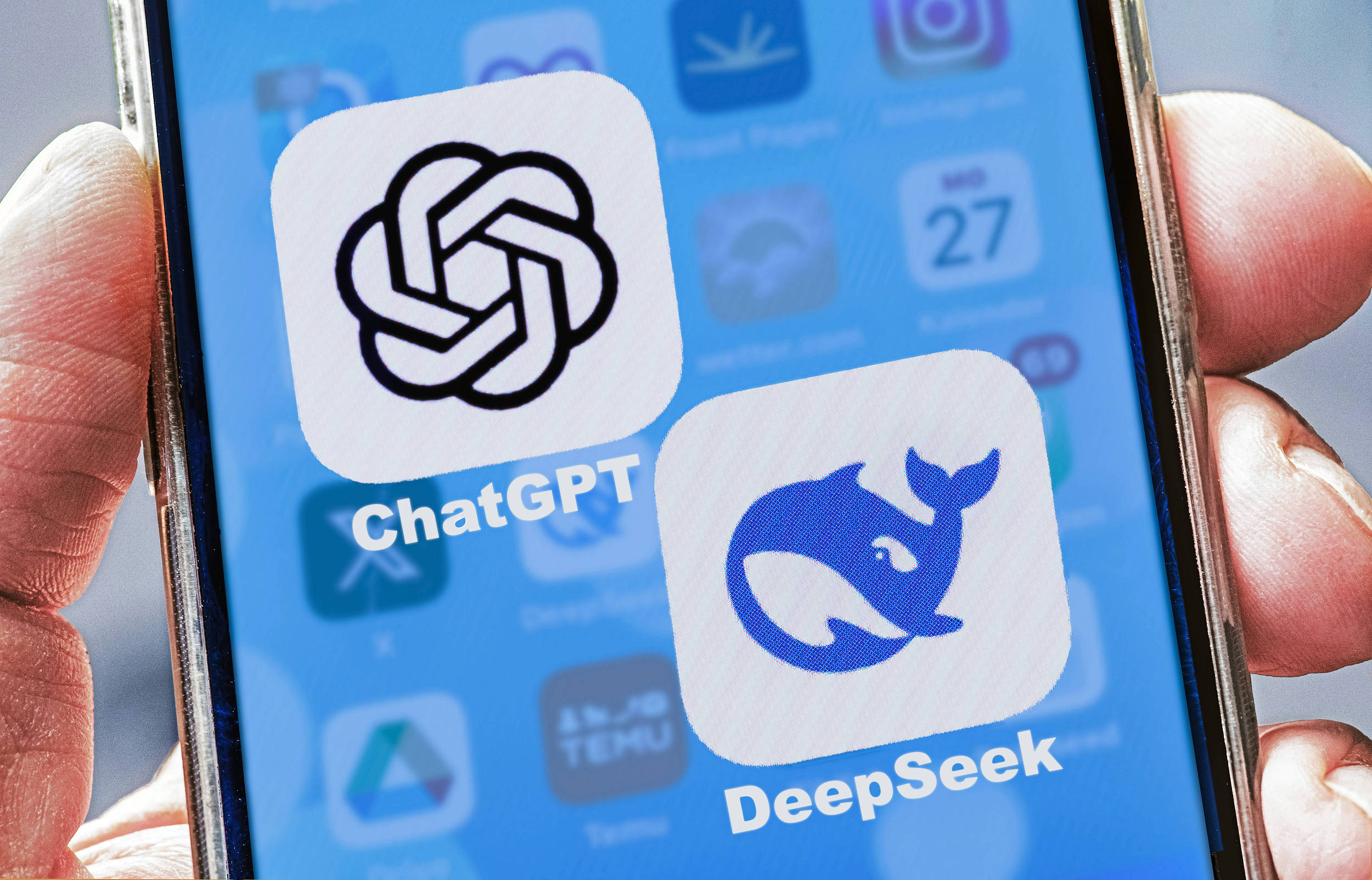 当地时间2025年1月,德国慕尼黑,中国人工智能语言模型DeepSeek和美国应用ChatGPT在手机屏幕上的对比。(图片来源:视觉中国)