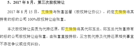 另外公开披露还显示,上海佳投在2016年3月成立后的头18个月里,存在“创始人(张富)—配偶(邱玉兰)—朋友(支腾腾)”层层代持的股权安排,且历次转让均未支付对价,直到2017年8月才全部还原到创始人张富名下。