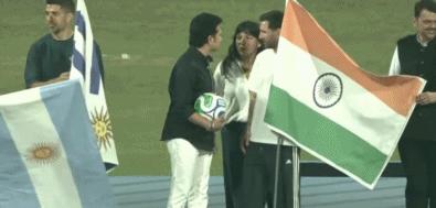 作为这次活动的最后一个环节,板球传奇巨星萨钦 - 滕杜卡尔走上看台,与梅西握手,并且向梅西赠送了 10 号球衣。