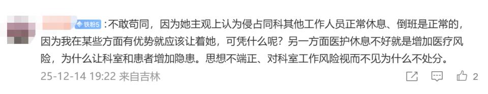记者于 12 月 13 日晚 10 时 30 分找到张水华所在科室护士长,该护士长表示,没有对张水华特殊照顾,也不会因此针对她," 我们现在对她也是正常排班 "。