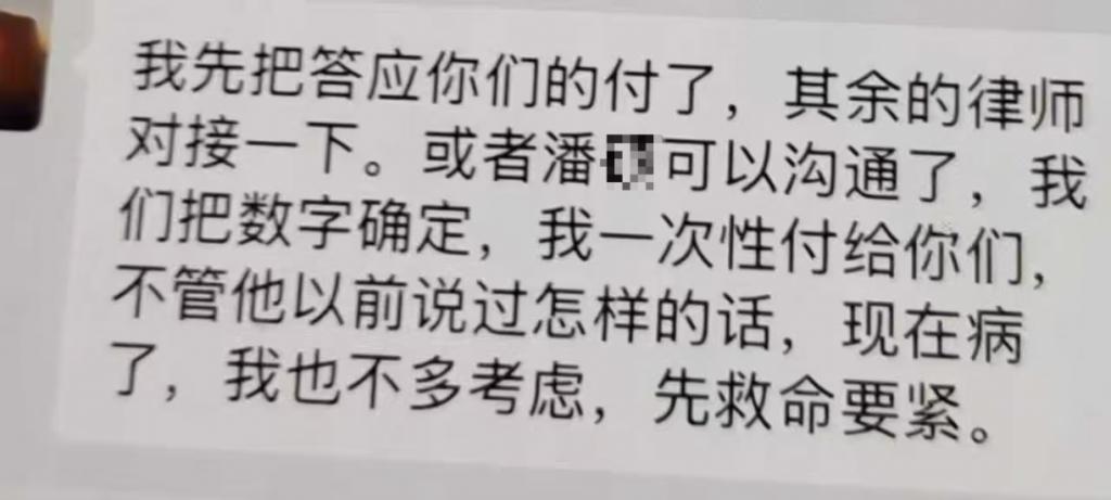 潘某姑姑提供的微信截图显示,15 日下午 5 点戴琳转过来了 5000 元,然后发消息称:" 我先把答应你们的付了,其余的律师对接一下。或者潘某可以沟通了,我们把数字确定,我一次性付给你们,不管他以前说过怎样的话,现在病了,我也不多考虑,先救命要紧。"