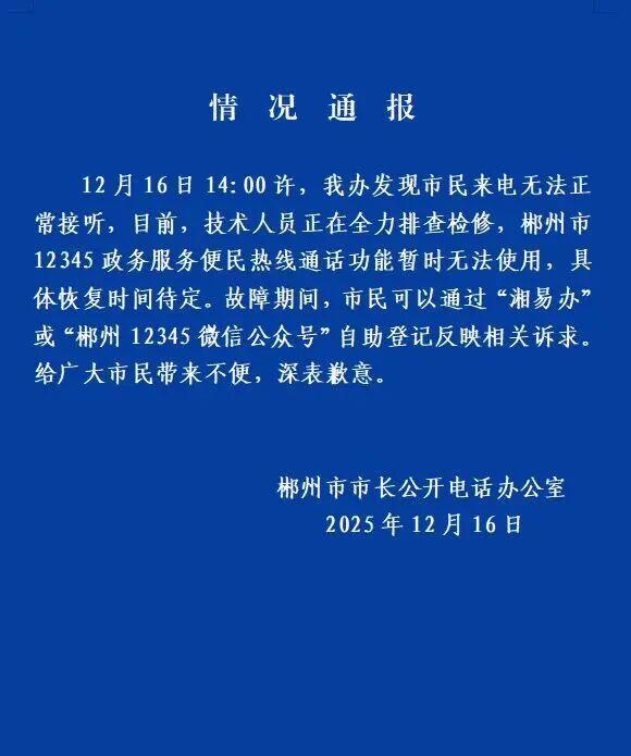 首页 > 生活 湖南郴州通报“市民来电无法接听”:技术人员正全力排查检修 湖南省郴州市市长公开电话办公室通报:12 月 16 日 14:00 许,该办发现市民来电无法正常接听,目前,技术人员正在全力排查检修,郴州市 12345 政务服务便民热线通话功能暂时无法使用,具体恢复时间待定。故障期间,市民可以通过 " 湘易办 " 或 " 郴州 12345 微信公众号 " 自助登记反映相关诉求。给广大市民带来不便,深表歉意。来源 | 郴州市市长公开电话办公室