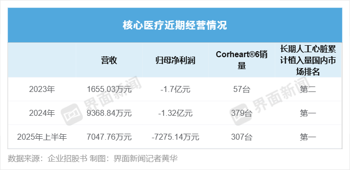 据招股书,核心医疗现已布局5款植入式和6款介入式人工心脏产品,能覆盖长期/短期支持、左心/双心支持、幼儿/成人支持等临床需求。经营数据显示,核心医疗尚未形成稳定盈利,但营收正在快速增长。据招股书,2023年、2024年及2025年上半年,核心医疗的营收逐年递增;同期的归母净利润的亏损情况逐步收窄。
