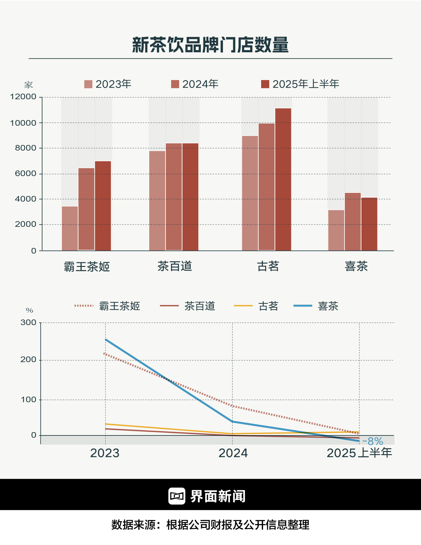 茶百道2025年上半年财报也显示,中国市场的门店数量增速也到了近年最低,同比仅增加0.7%。喜茶方面,据极海品牌监测的数据,截至2025年10月的过去12个月,它的门店净减少680家。