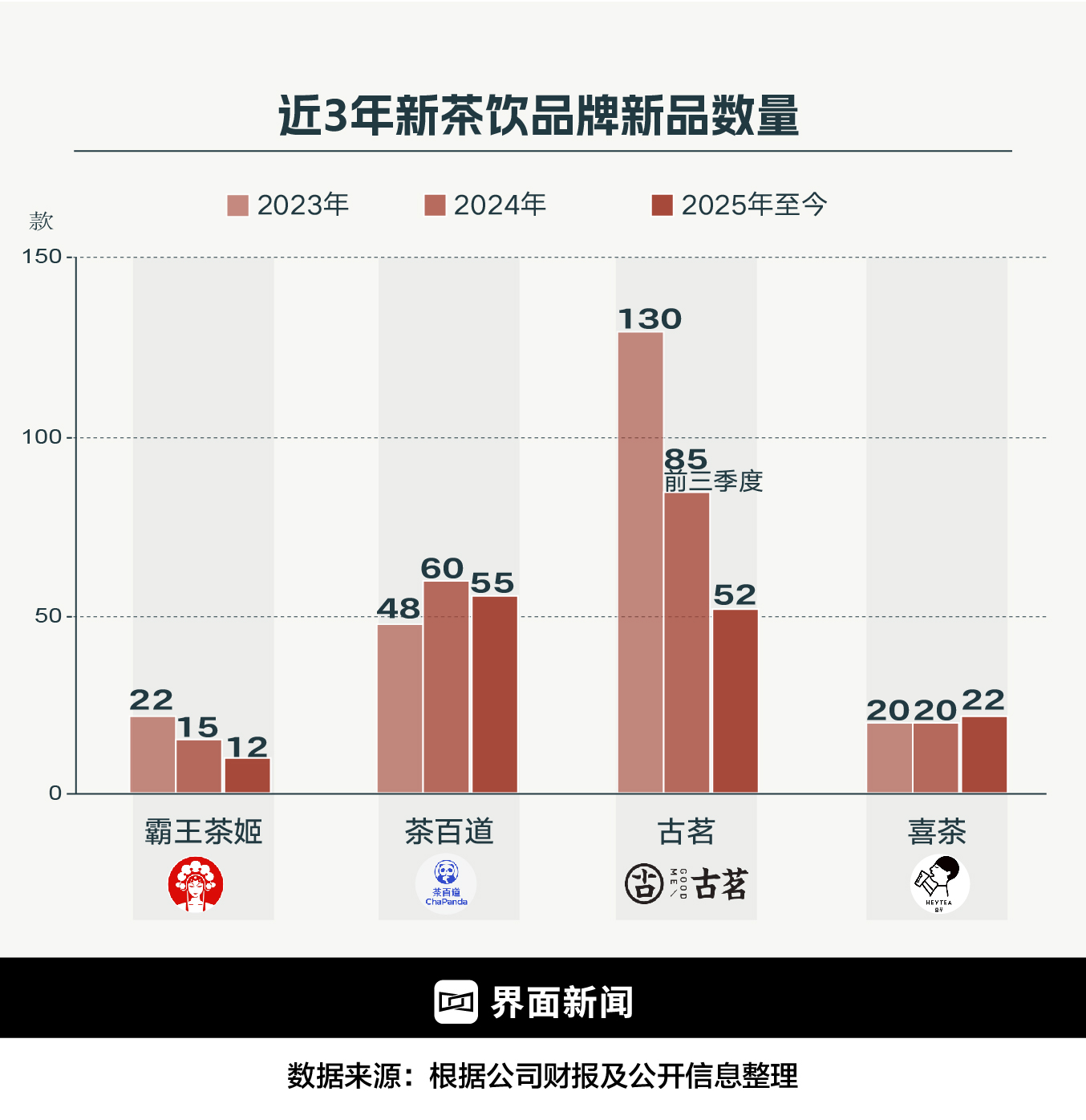 界面新闻自公开信息统计,2024年茶百道推出新品60款,并对42款经典产品进行了配方升级,这一数字在2025年上半年变成共有新品55款,对9款产品进行了升级迭代。