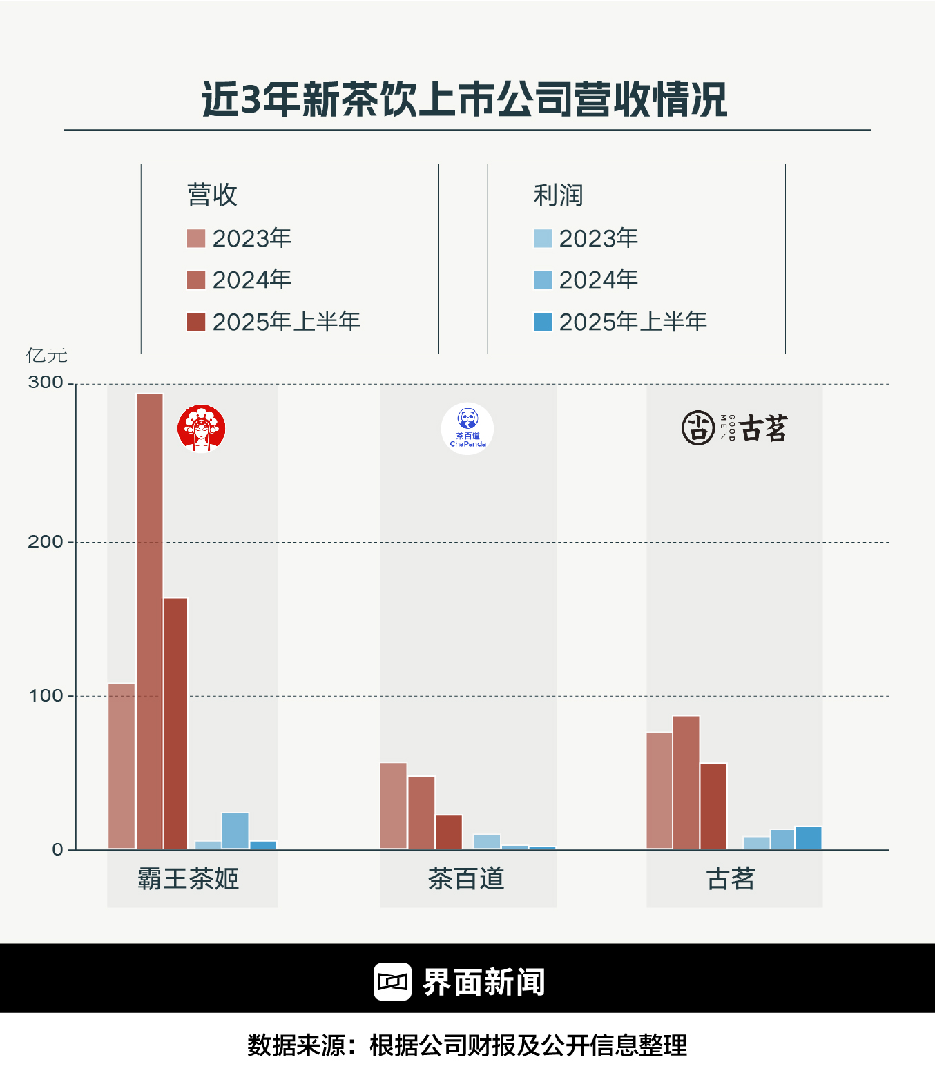 霸王茶姬今年第三季度净收入同比下降9.4%,经调整后净利润下降22.3%,大中华区总GMV同比下降6%;古茗单店GMV在2024年同比下滑4.3%;而茶百道在2024年年内利润4.8亿元,较上一年同比下降近六成。
