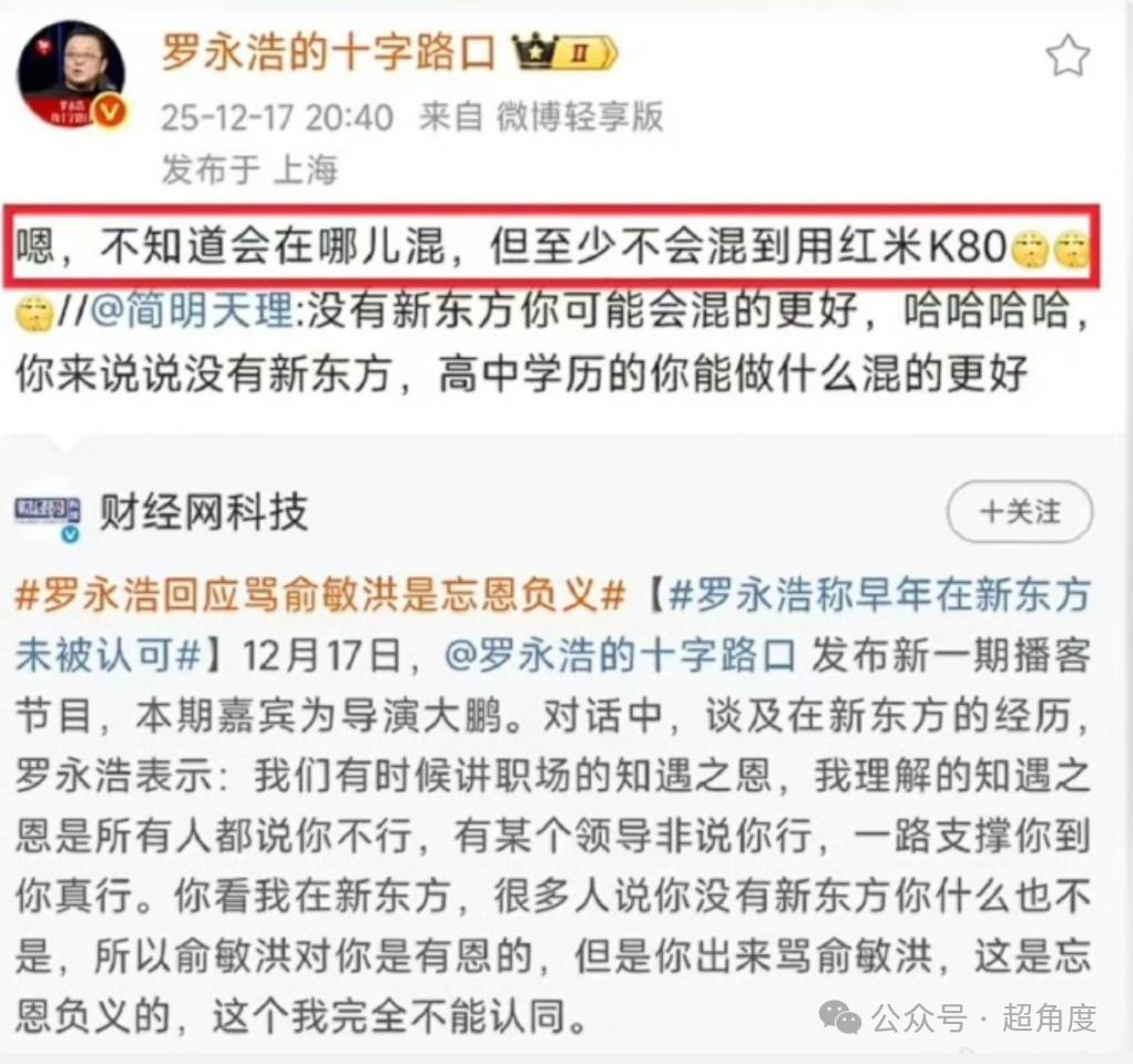 近日,有网友评论 " 罗永浩回应骂俞敏洪是忘恩负义 " 话题时称:" 没有新东方你可能会混的更好,哈哈哈哈,你来说说没有新东方,高中学历的你能做什么混的更好。"