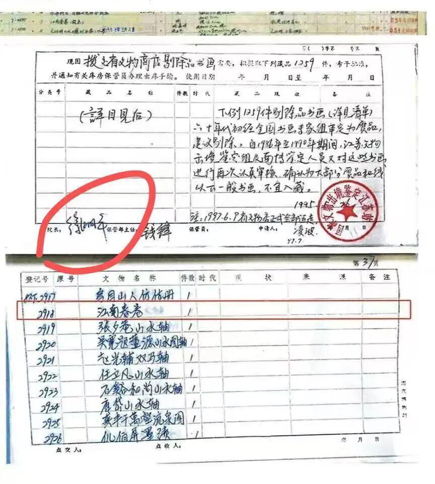 拨交证明有时任院长徐湖平、保管部主任钱锋、申请人凌波的签字。2001 年 4 月 16 日《江南春》被 " 顾客 " 以 6800 元价格购买,销售清单明示为《仿仇英山水卷》。