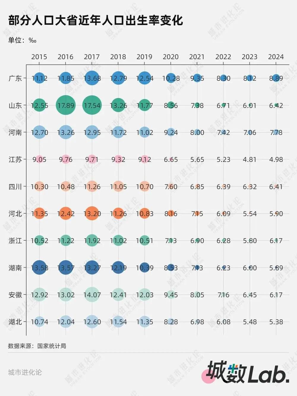 一些曾被认为 " 最能生 " 的人口大省,如广东、河南、山东等,近年人口出生率和出生人口也都出现不同程度下降。以山东为例,2024 年出生人口(64.9 万人)已减少至 2016 年(177.1 万人)三成左右。
