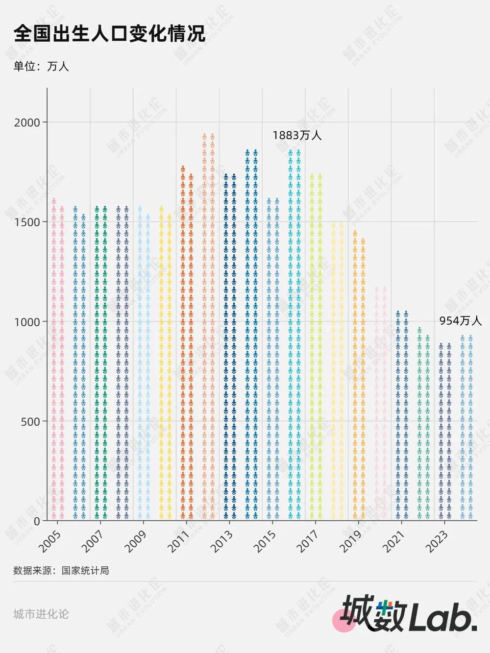比人口规模先一步由增转降的是人口出生率。2016 — 2024 年,全国人口出生率从 13.57 ‰降至 6.77 ‰,除 2024 年略微回升外,其余年份均呈下降趋势,其中 2023 年为近 20 年最低水平;同期,出生人口从 1883 万人大幅缩减至 954 万人,9 年时间几乎 " 腰斩 "。