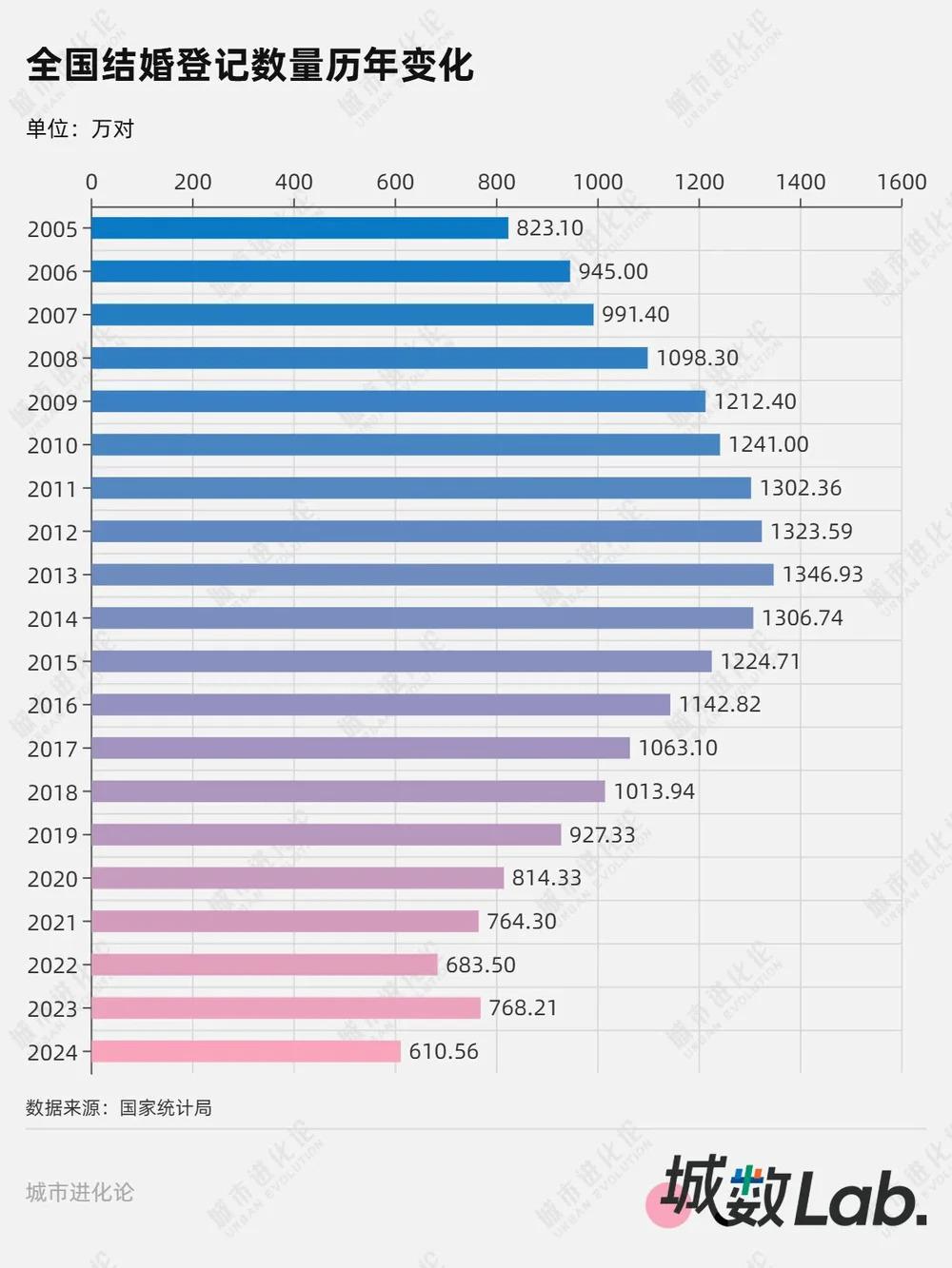 结婚人数持续减少,进一步限制了潜在生育人群规模——全国结婚登记数自 2013 年以来连年下降(2023 年除外),2024 年跌至近 20 年新低,已不足 2013 年一半。