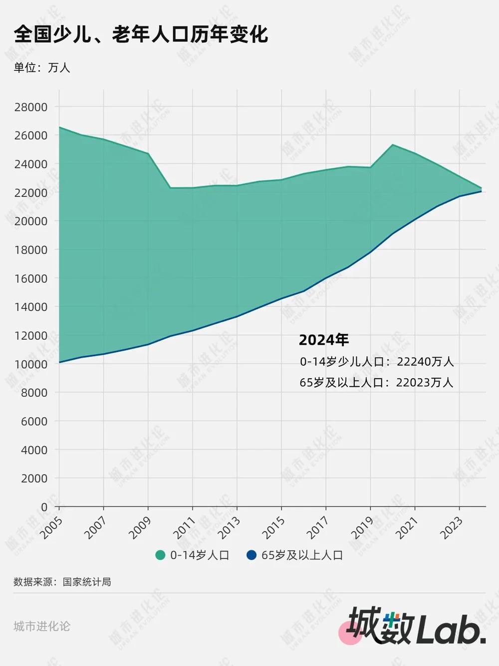 人口结构变化随之而来。2024 年,我国 0~14 岁少儿人口跌至近 20 年新低,占比仅为 15.8%,远低于世界平均水平;60 岁及以上人口首次突破 3 亿人、占比 22%,65 周岁及以上人口占比达 15.6%,少子化、老龄化趋势日益突出。