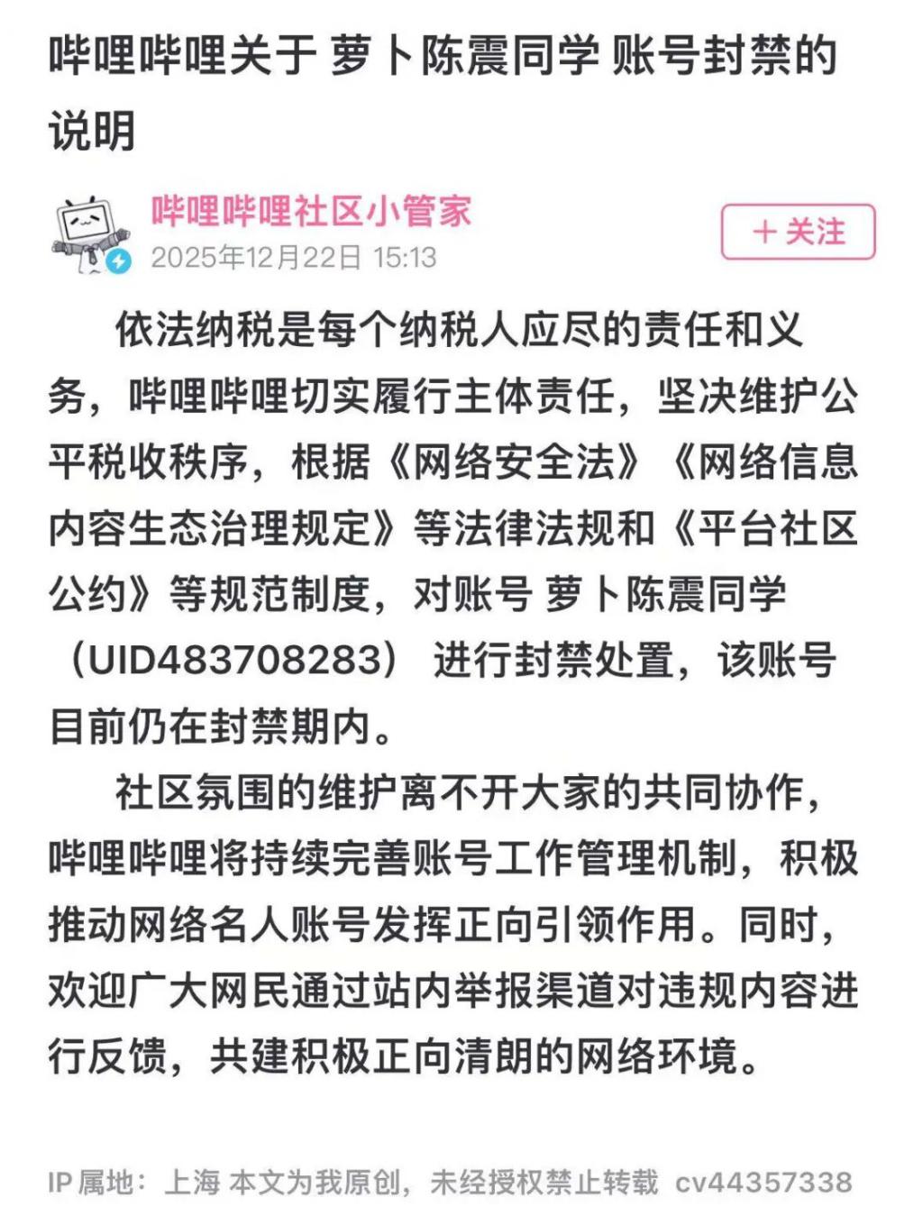 先是小红书用户惊喜发现 " 陈震同学 " 账号恢复正常,封禁标识不见踪影,随即在车友群和社交媒体引发热议。
