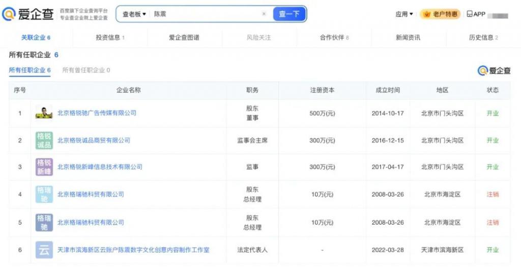 数据显示,陈震单条广告报价一度高达 80 万元,2024 年仅上半年就入账千万。名下关联 4 家企业,业务涵盖广告、传媒、信息技术等多个领域,俨然构建起自己的商业帝国。