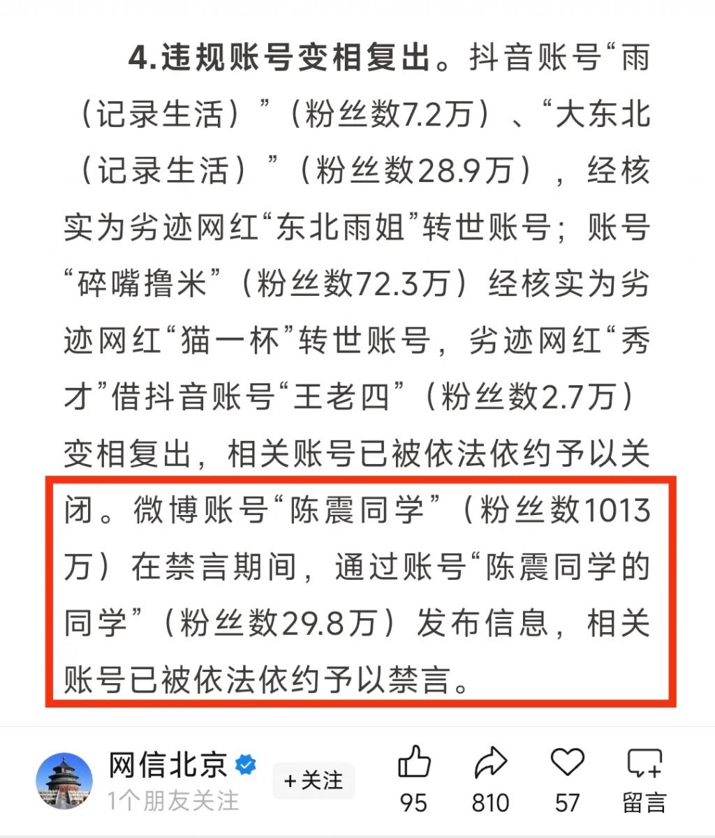 被查后,陈震试图用小号发布 " 反思视频 ",称 " 自作自受 "。但为时已晚,北京网信办已将其列为 " 劣迹网红变相复出 " 典型案例,从源头堵死了他的复出之路。