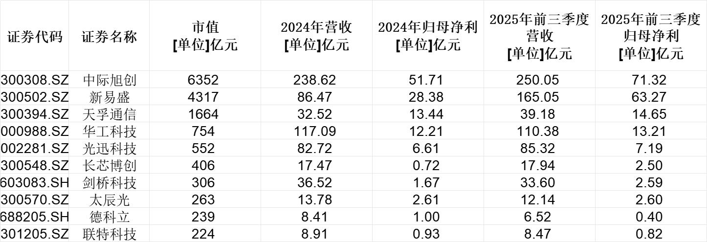 中际旭创2025年前三季度营收、净利分别达250.05亿元、71.32亿元。天孚通信、华工科技等企业2025年前三季度营收普遍在30-110亿元区间;而部分中小规模企业,2025年前三季度净利多在3亿元以下,尾部企业的盈利空间持续被压缩。