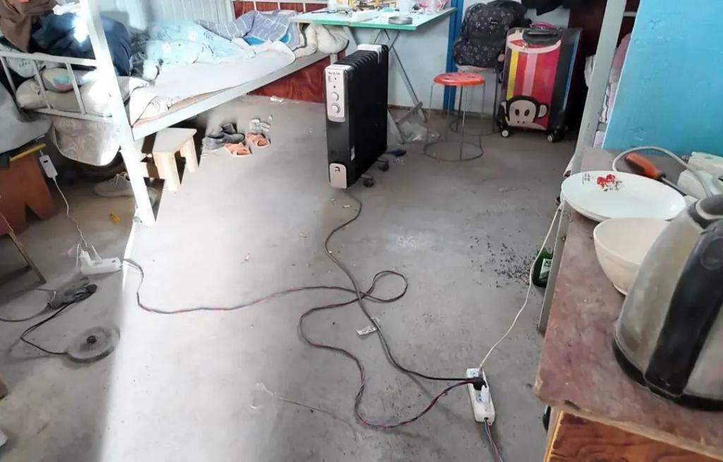 同样的用电乱象也蔓延到了工人生活区。考核巡查组随机抽查了一间正在使用的工人宿舍,在这间设有四张床位的房间里,烧水壶、电暖器、电褥子等电器随意摆放,地面上麻花插线缠绕交织,还散落着未清理的烟头。检查人员随后发现,宿舍旁配置的灭火器早已失效,形同虚设。