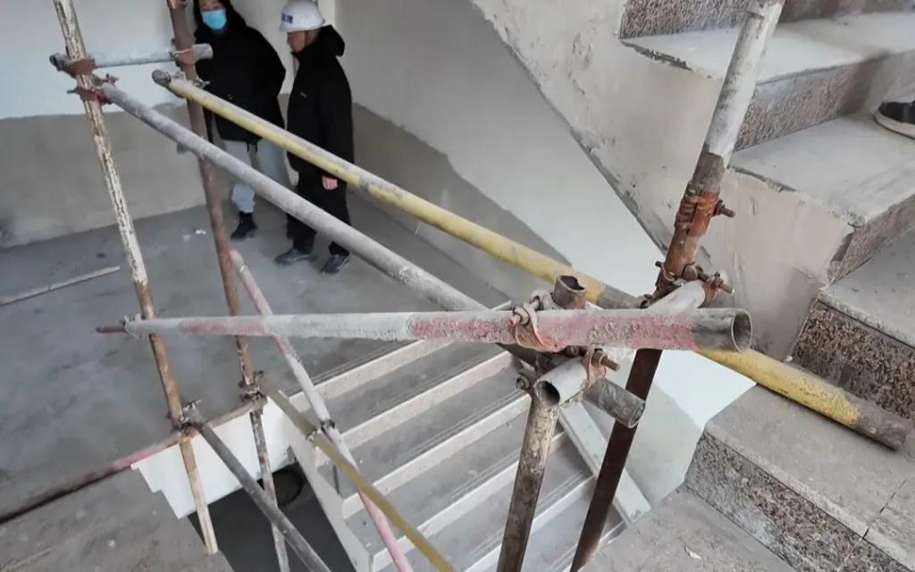 体育馆内,考核巡查组看到,楼梯护栏仅用钢管简易搭建,部分楼梯仅存在一根与楼梯坡度平行的钢管以及作为固定的竖直钢管,且钢管离楼梯有一定距离,钢管的上方、下方以及上下楼梯间都有很大的缝隙,一旦踩空,人员容易从楼梯间的缝隙滑下,造成高空坠落。