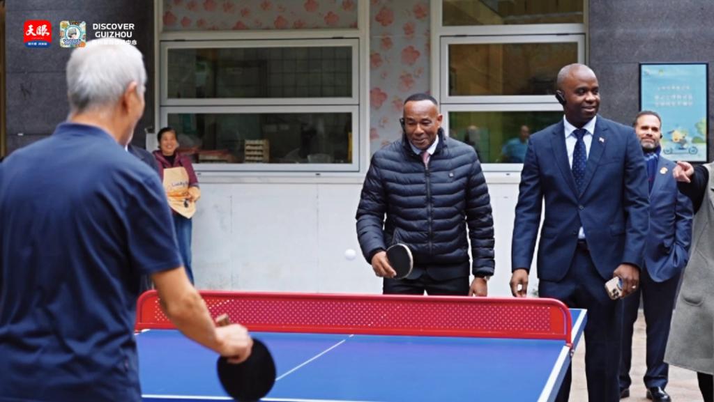 金黄的银杏树下,乒乓球台旁,社区居民们激战正酣。围观的拉美和加勒比国家驻华使节们技痒难耐,现场与居民们切磋起了球技。