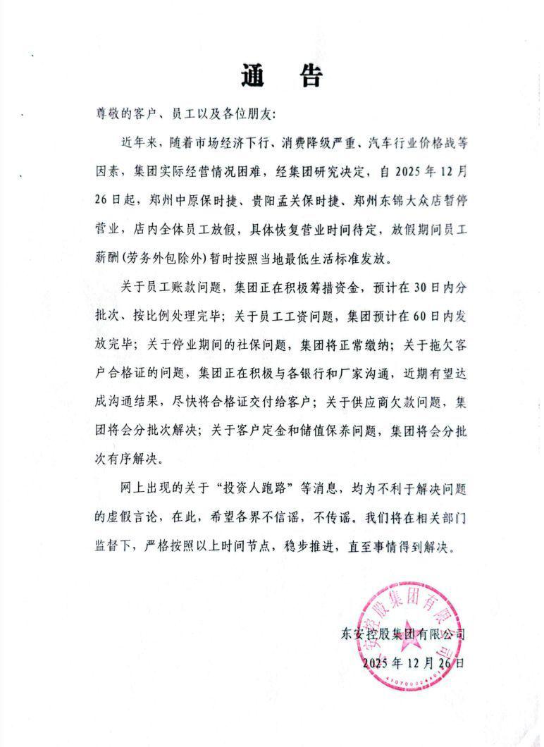 近年来,随着市场经济下行,消费降级严重,汽车行业价格战等因素,集团实际经营情况困难,经集团研究决定,自 2025 年 12 月 26 日起,郑州中原保时捷、贵阳孟关保时捷、郑州东锦大众店暂停营业,店内全体员工放假,具体恢复营业时间待定,放假期间员工薪酬(劳务外包除外)暂时按照当地最低生活标准发放。