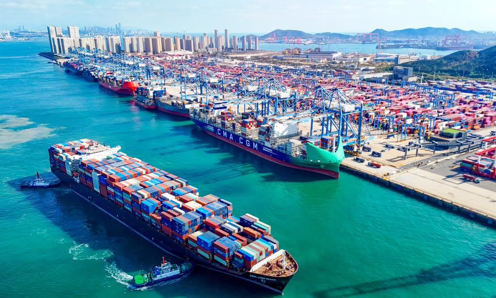 2025 年 11 月 5 日,一艘货轮满载货物驶出青岛自贸片区(无人机照片)。新华社发(张进刚摄)