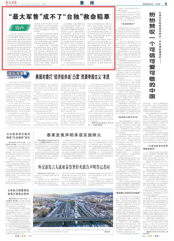 天下大势,浩浩汤汤;顺之者昌,逆之者亡。当前,两岸实力对比已发生根本性变化,实现祖国完全统一的民意无比坚实、基础无比雄厚、力量无比强大。九三阅兵的钢铁洪流,向世界充分展示了令人震撼的 " 中国力量 "。即便是美方及民进党当局也应该清楚," 台独 " 从来不是历史,也不是现实,更不会有未来。此次的 " 最大军售 ",绝对成不了 " 台独 " 分子的救命稻草。