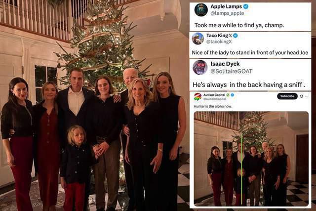 2025 年 12 月 24 日平安夜,美国前总统乔・拜登在 X 平台(原推特)发布了一张家庭合影,向公众送上 " 祝你平安快乐,充满喜悦 " 的节日祝福,原本温馨的节日分享却因奇特的构图和站位引发全网热议。在这张以装饰精美的圣诞树为背景的合影中,83 岁的拜登被挤在后排角落,近乎 " 隐形 ",而 55 岁的儿子亨特则站在前景显眼位置,成为画面绝对焦点。