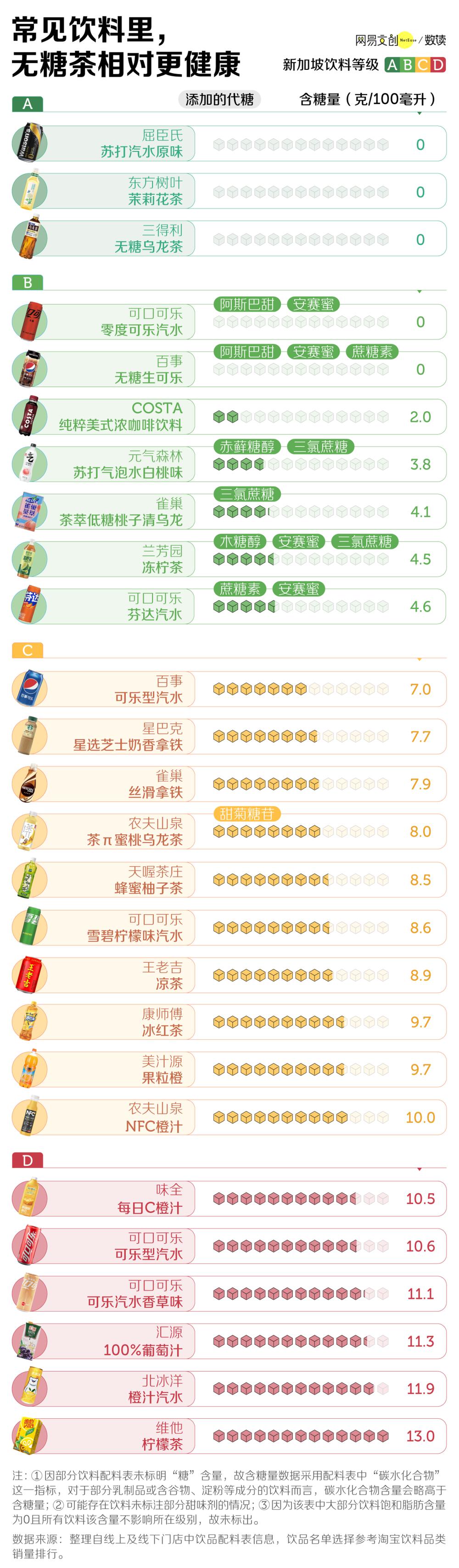 而一般的速溶咖啡、含糖碳酸饮料、果汁、含糖茶饮等基本都得躺枪,要被评为 C 级或 D 级。
