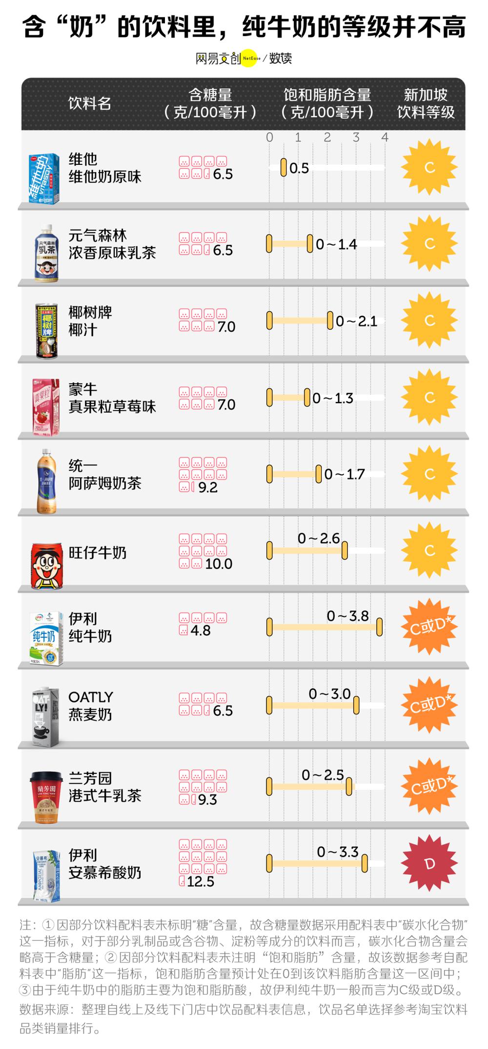 由于全脂牛奶会有饱和脂肪,这就导致其等级可能会落到 C 或 D 级,甚至比不上齁甜的瓶装奶茶 。