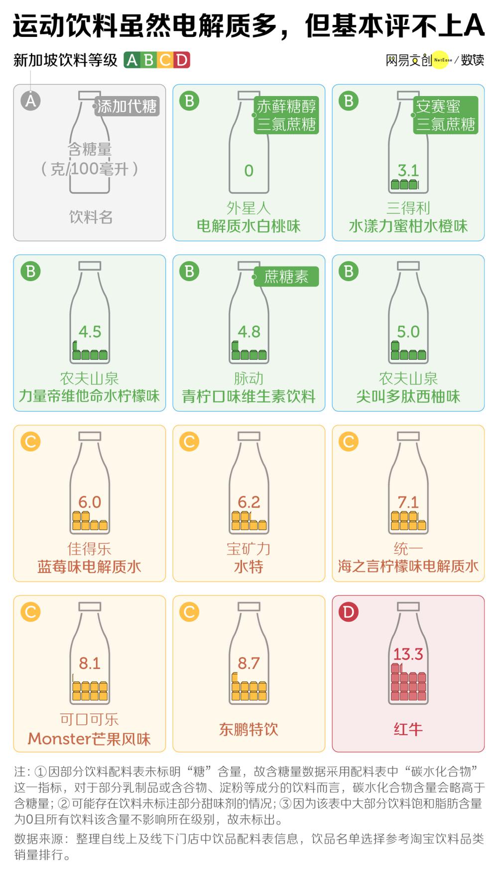 此外,各种能补充电解质的运动饮料也基本因为含糖量高而评不上 A 级。