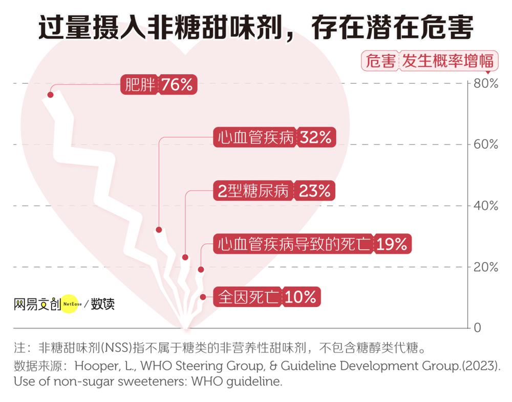 2023 年,世界卫生组织发布了关于非糖甜味剂的新指南,引用了一项荟萃分析的结果,发现用代糖未必就能减肥,过量摄入非糖甜味剂反而会增加 76% 的肥胖风险。