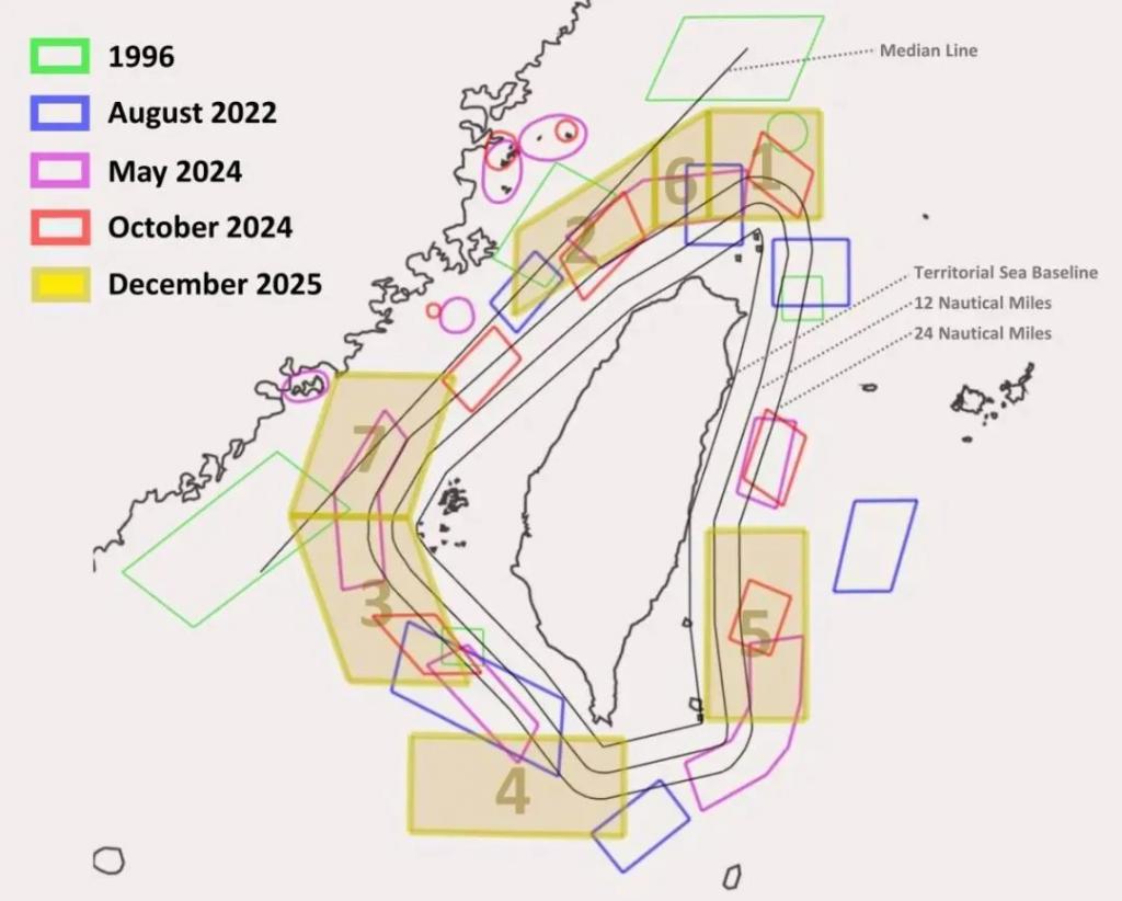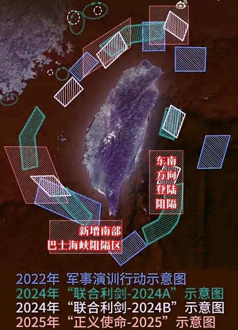 2025 年即将结束之际,解放军东部战区在台湾岛周边划出 5 个演习区,即将举行一场代号 " 正义使命 -2025" 的对台军演,目前明确的军演时间为 10 个小时,但不排除会延长演习时长。
