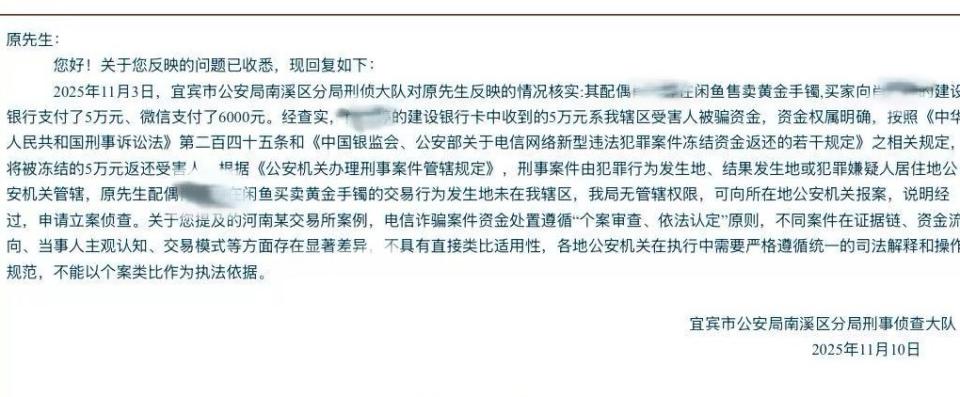 原晓的遭遇便是一个典型案例。当他援引河南某粮食商 28 万元资金被冻结后成功解冻的案例,向宜宾警方提出异议时,得到的回复是:电信诈骗案件的资金处置遵循 " 个案审查、依法认定 " 原则,不同案件在证据链完整性、资金流向、当事人主观认知、交易模式等方面均存在差异,不具有直接类比适用性。