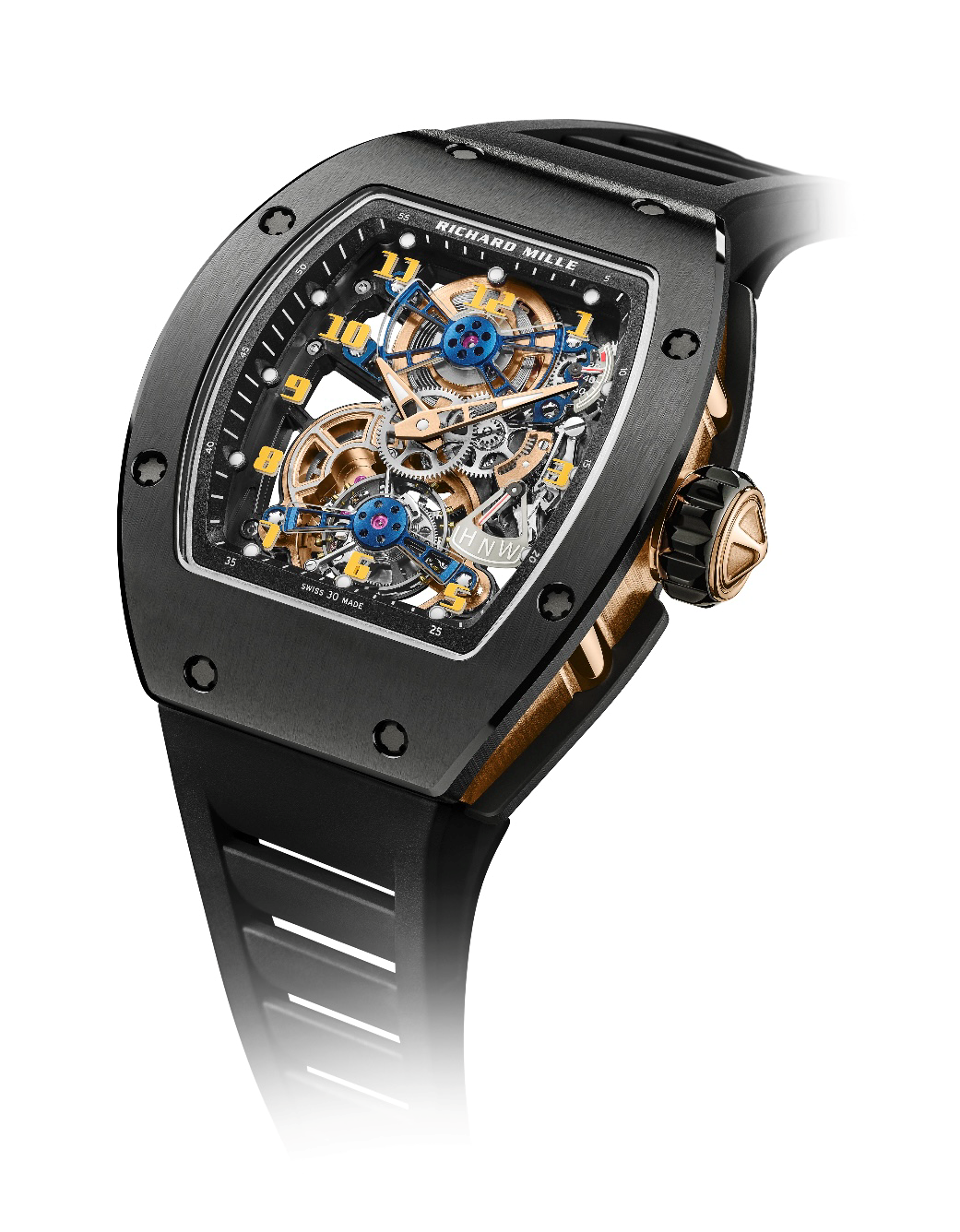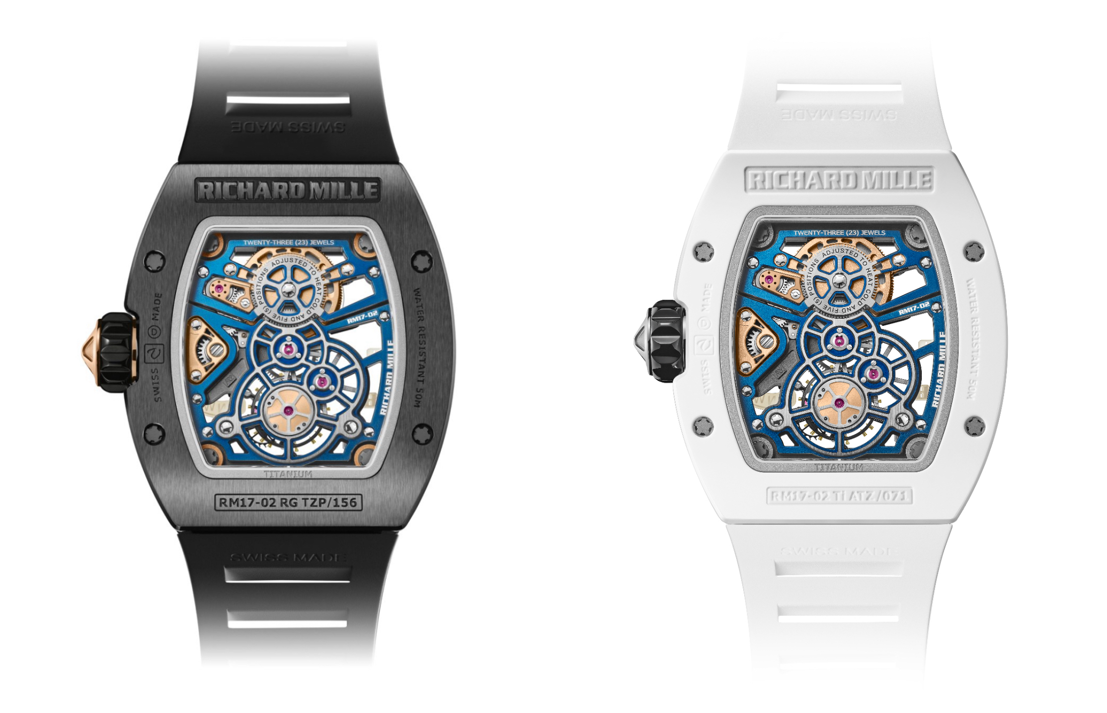 RICHARD MILLE 理查米尔 17-02 陀飞轮的两款全新诠释版本,均由同一枚超镂空钛合金机芯驱动,但以截然不同的美学语言与独特个性脱颖而出。
