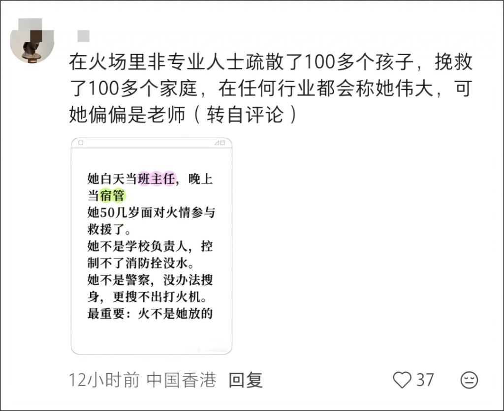 这也是很多人质疑的点,她哪里没及时疏散,她第一时间不报警是学校要求的,关她什么事。