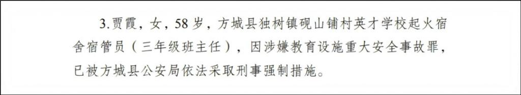 报告里提到贾霞涉嫌的罪名叫教育设施重大安全事故罪,量刑标准是三年以上、七年以下。