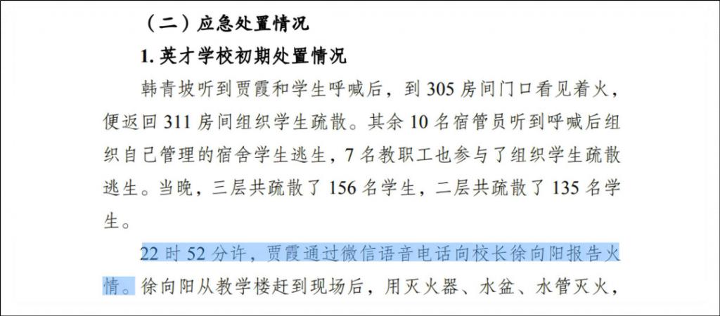 起火七分钟后,贾霞用微信语音电话向校长报告,校长再打电话找学校创办人过来。