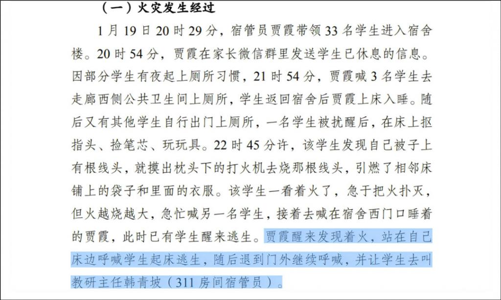 之前事故调查报告认定,贾霞未及时有效疏散学生、未第一时间报警。
